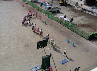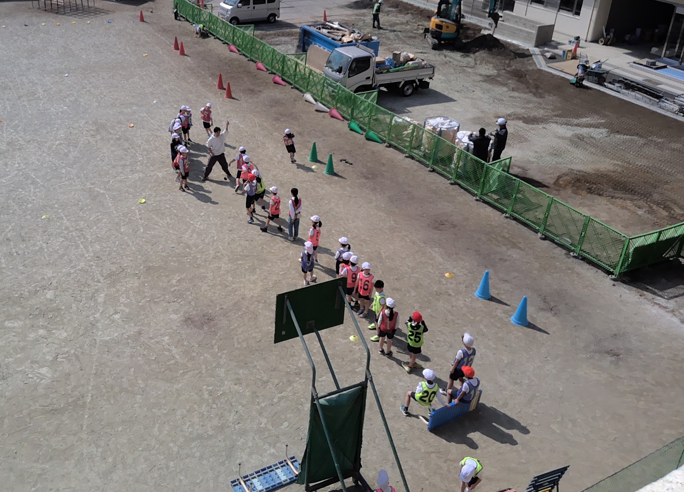 2校時、2の1と2の2は体育で、ボール蹴りゲームをしていました。