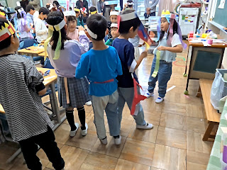 1・2校時、2の1は図工で「わっかで変身」の作品づくりをしていました。